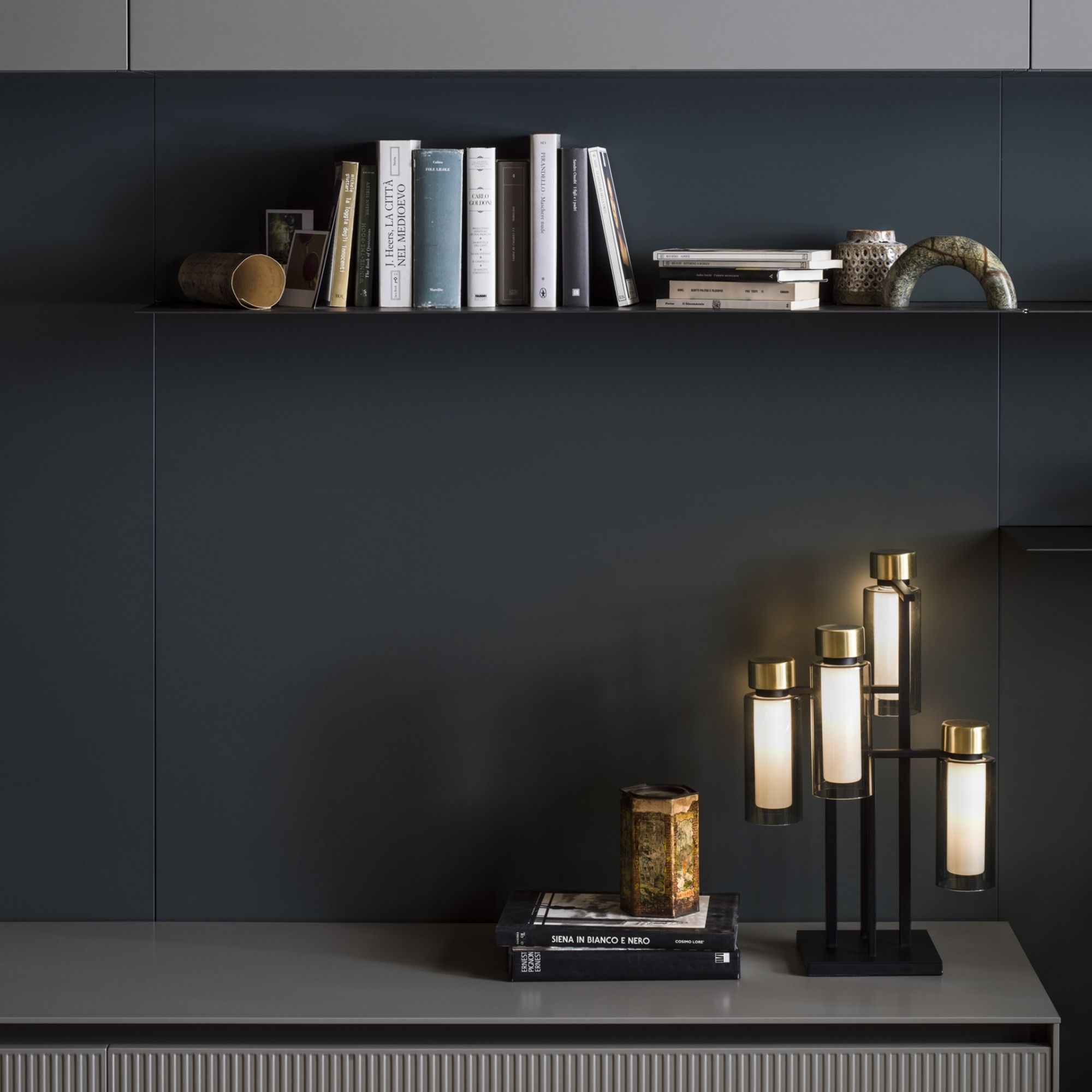 Osman Table Lamp by TOOY features the same refined architectural language as its chandelier counterparts, defined by a rational geometric structure paired with double walled cylindrical glass diffusers. The combination of metal, brass detailing, and softly illuminated glass creates a harmonious, elegant presence suitable for desks, bedside tables, reception areas, or decorative accent lighting.