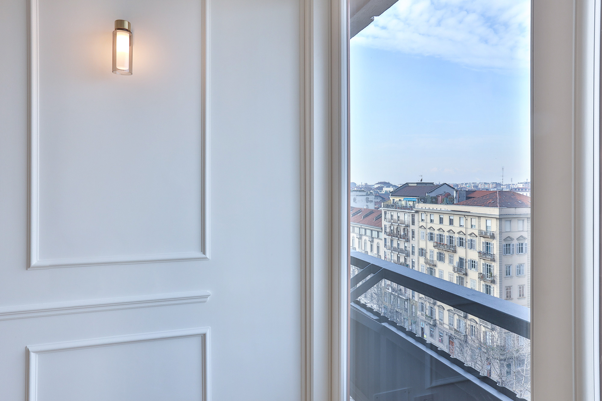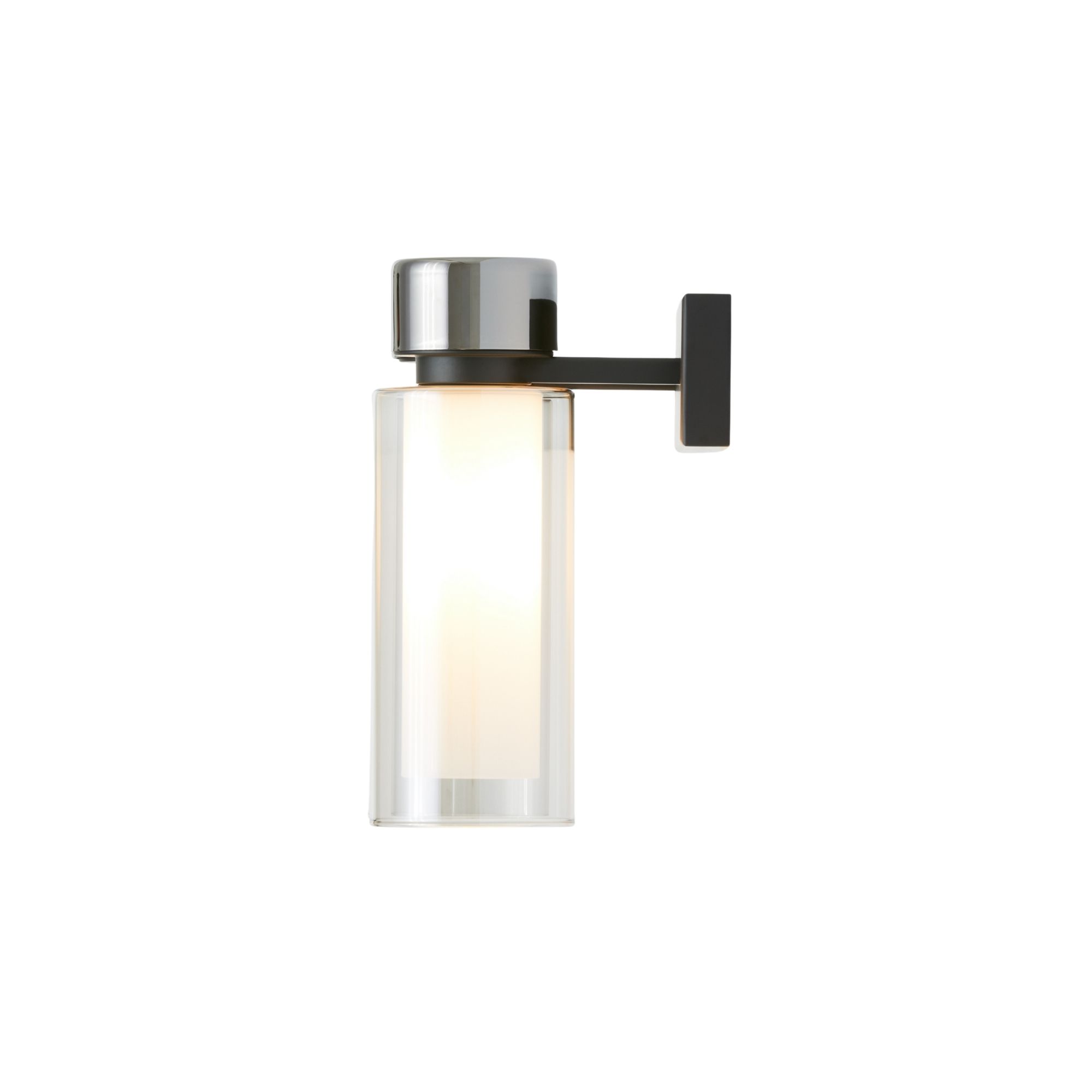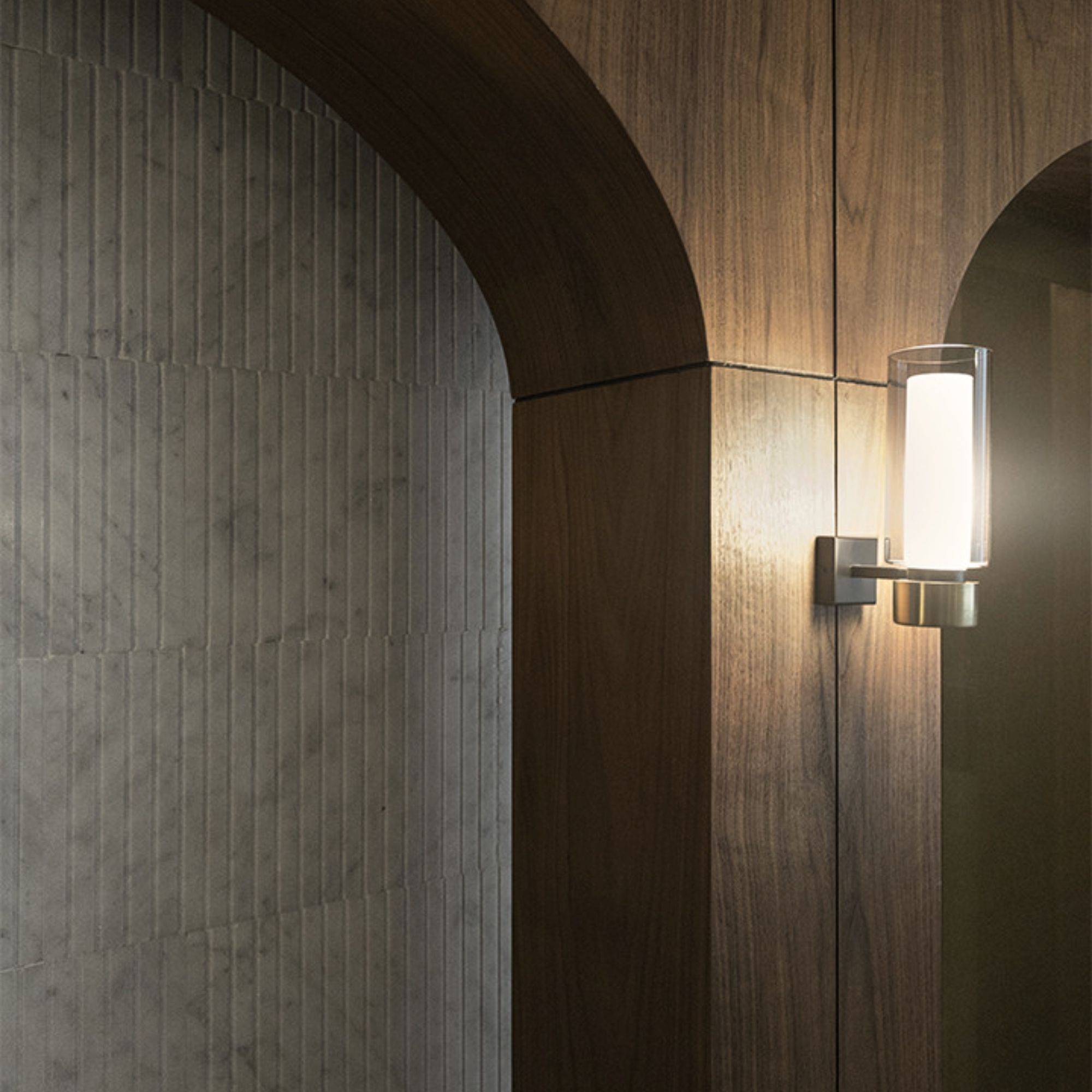 Osman Wall Sconce by TOOY features a rational, architectural design enriched with brushed metallic accents and double wall cylindrical diffusers that produce a soft and harmonious light effect. Its orthogonal structure and balanced proportions create a refined, contemporary feature suitable for hallways, living spaces, hospitality and commercial applications.