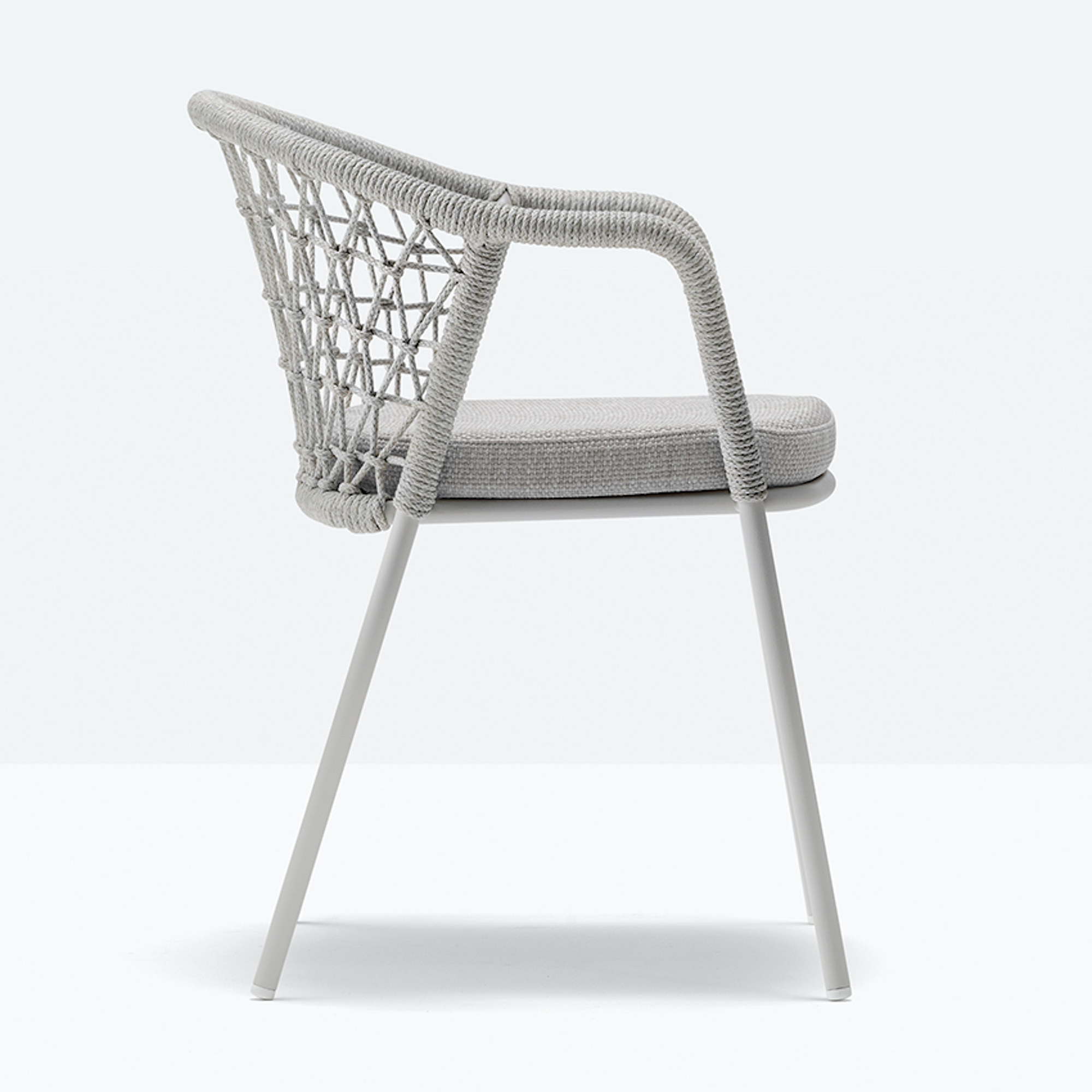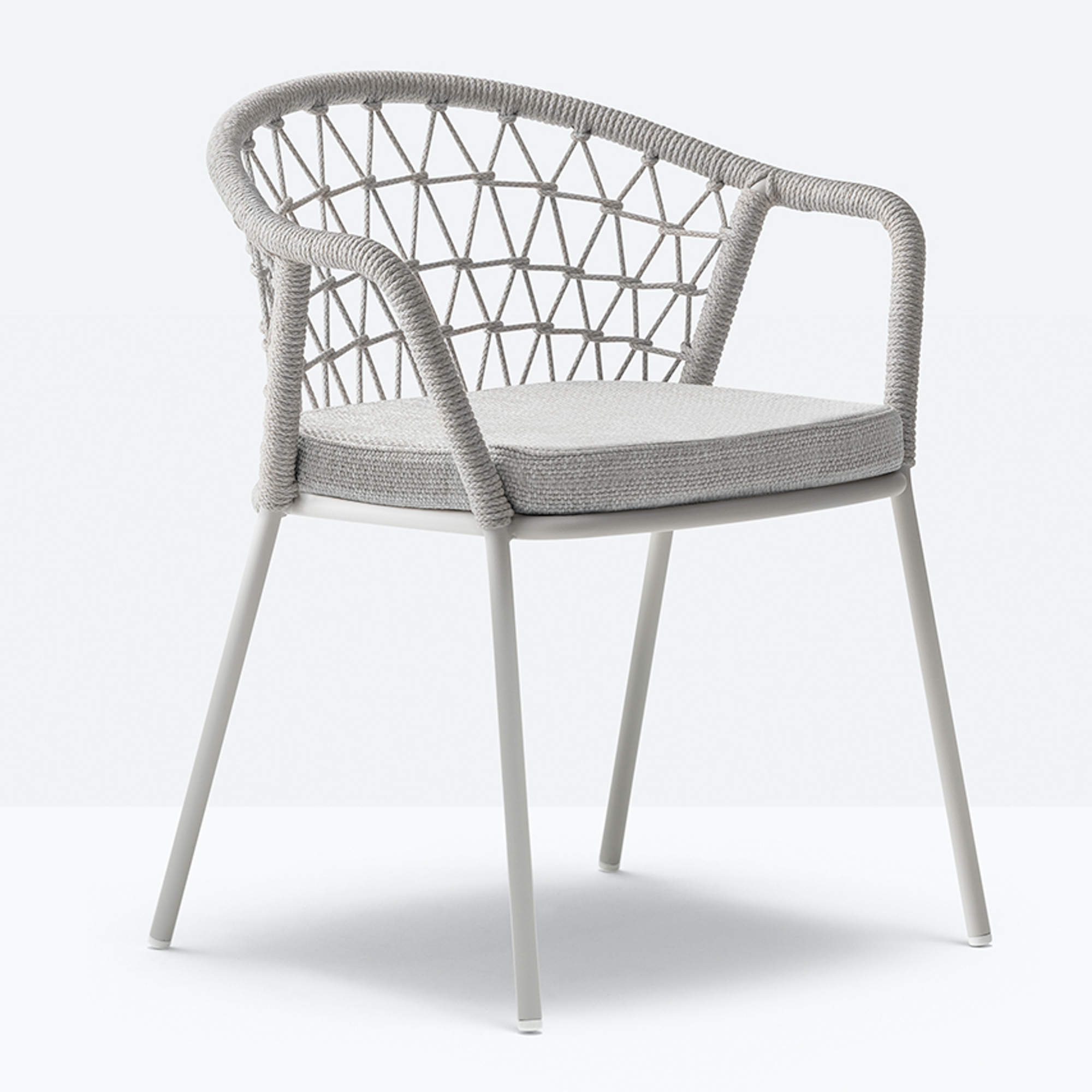 It features a traditional element in polypropylene cord hand-woven in Italy that wraps around the Ø 20 mm steel tube frame.