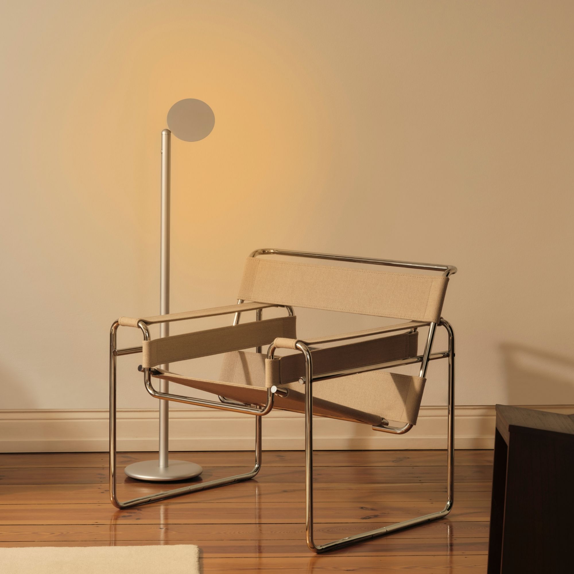 With sunset dimming, Parrot floor lamp transitions into warm, blue free light in the evening, creating a cosy atmosphere that naturally promotes rest. The distinctive tangential head, playfully positioned on the shaft, gives the lamp its iconic and characterful design.