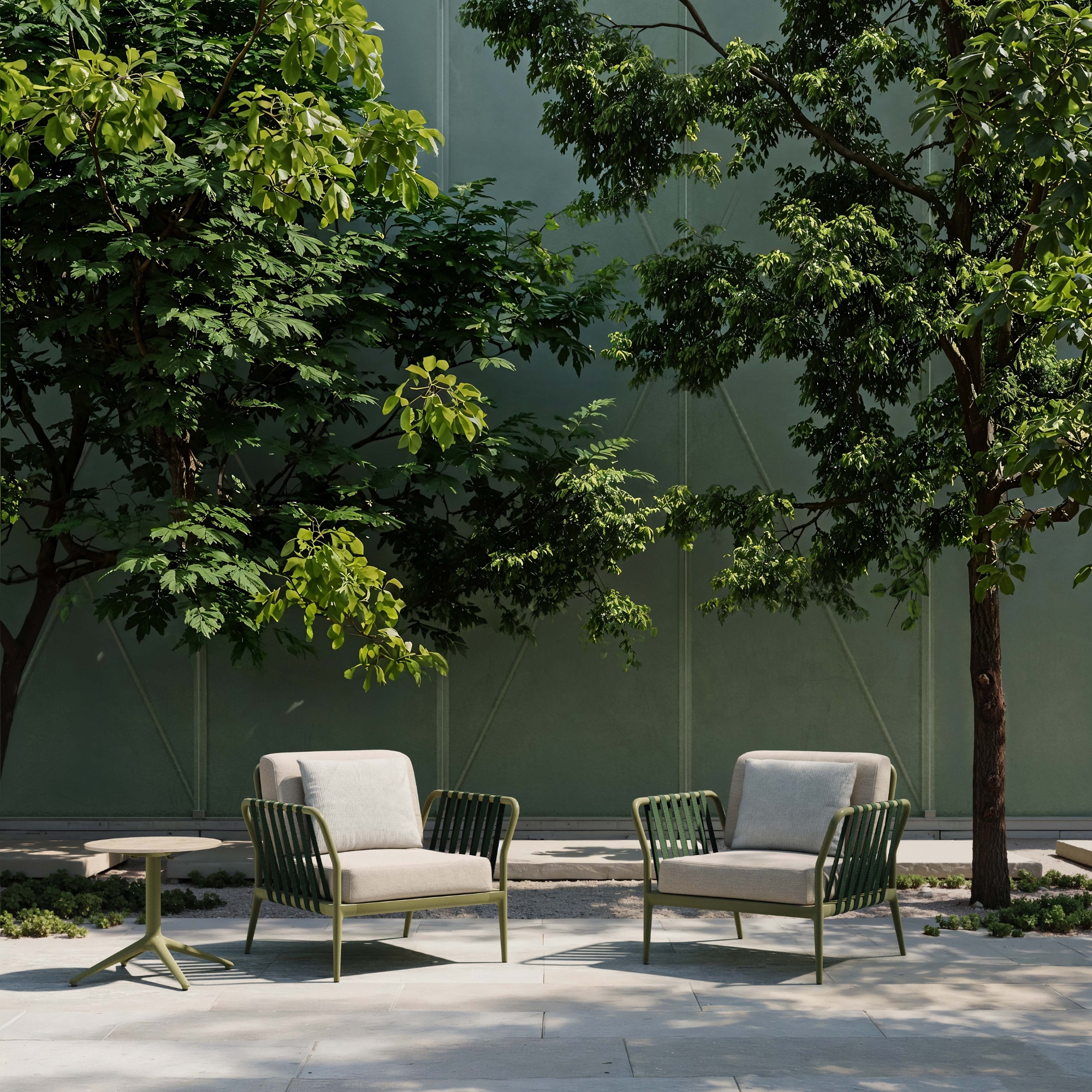 The lightweight aluminum structure serves as the frame, allowing the straps to take aesthetic precedence, a meticulous detail that subtly and stylishly projects its artisan reminiscences. This avant-garde design results in an armchair with subtle open forms, ideal for outdoor lounges.