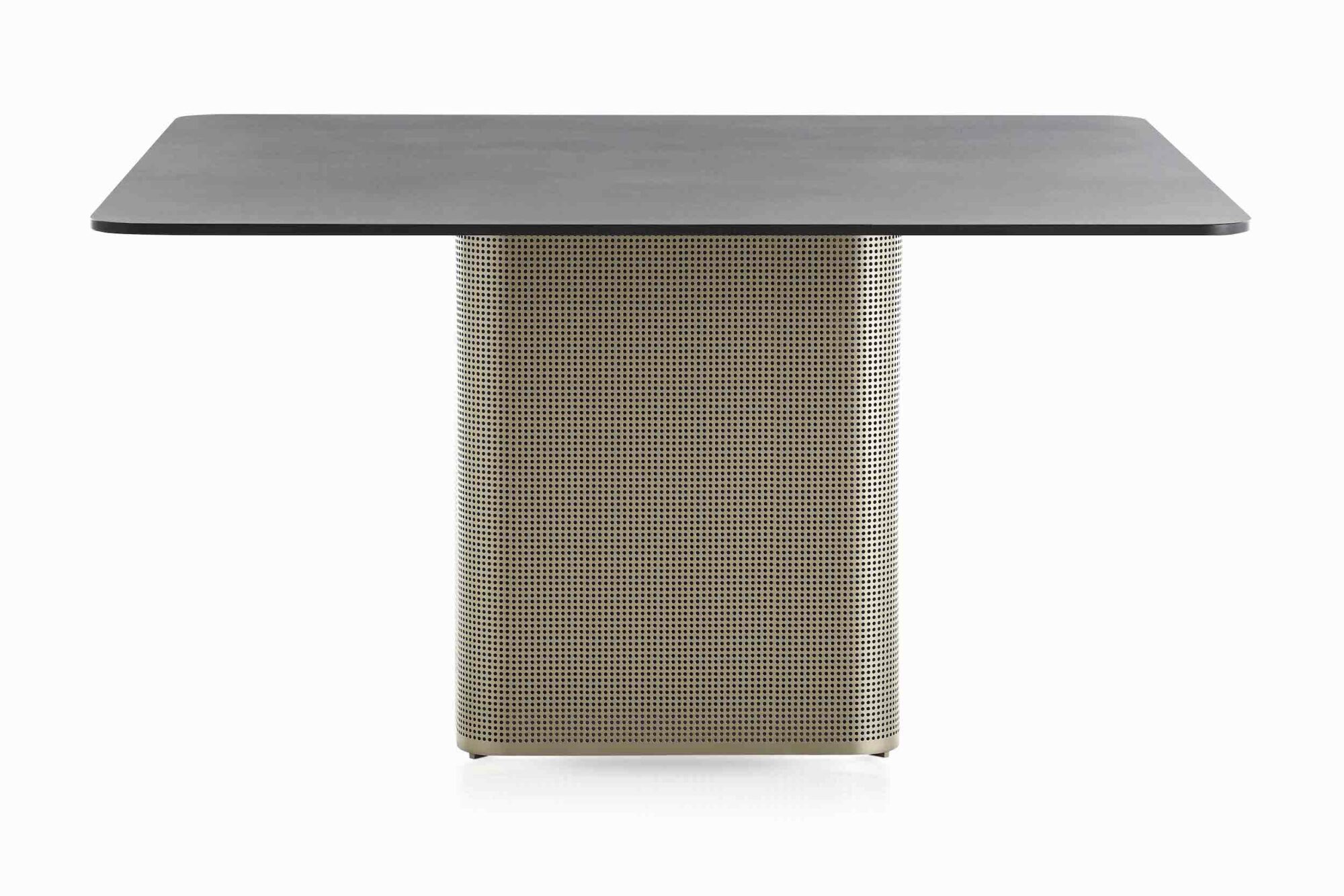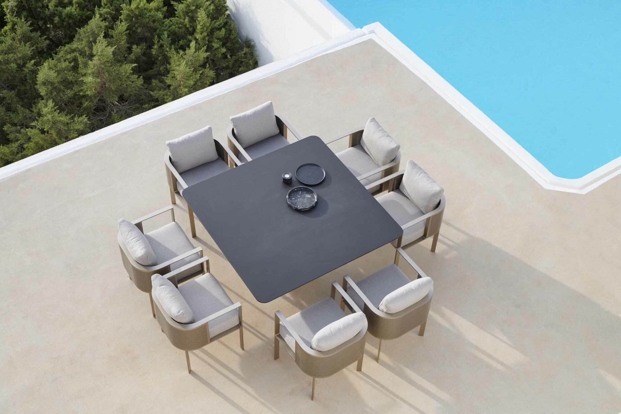 The top of this outdoor table is available in the ultra-resistant material Dekton® by Cosentino. It is ideal for creating your own outdoor dining room on terraces, gardens, hotels… the warmth of its curvilinear shapes make it equally ideal to be enjoyed paired with the Solanas chairs in interior spaces, dining rooms or living rooms.