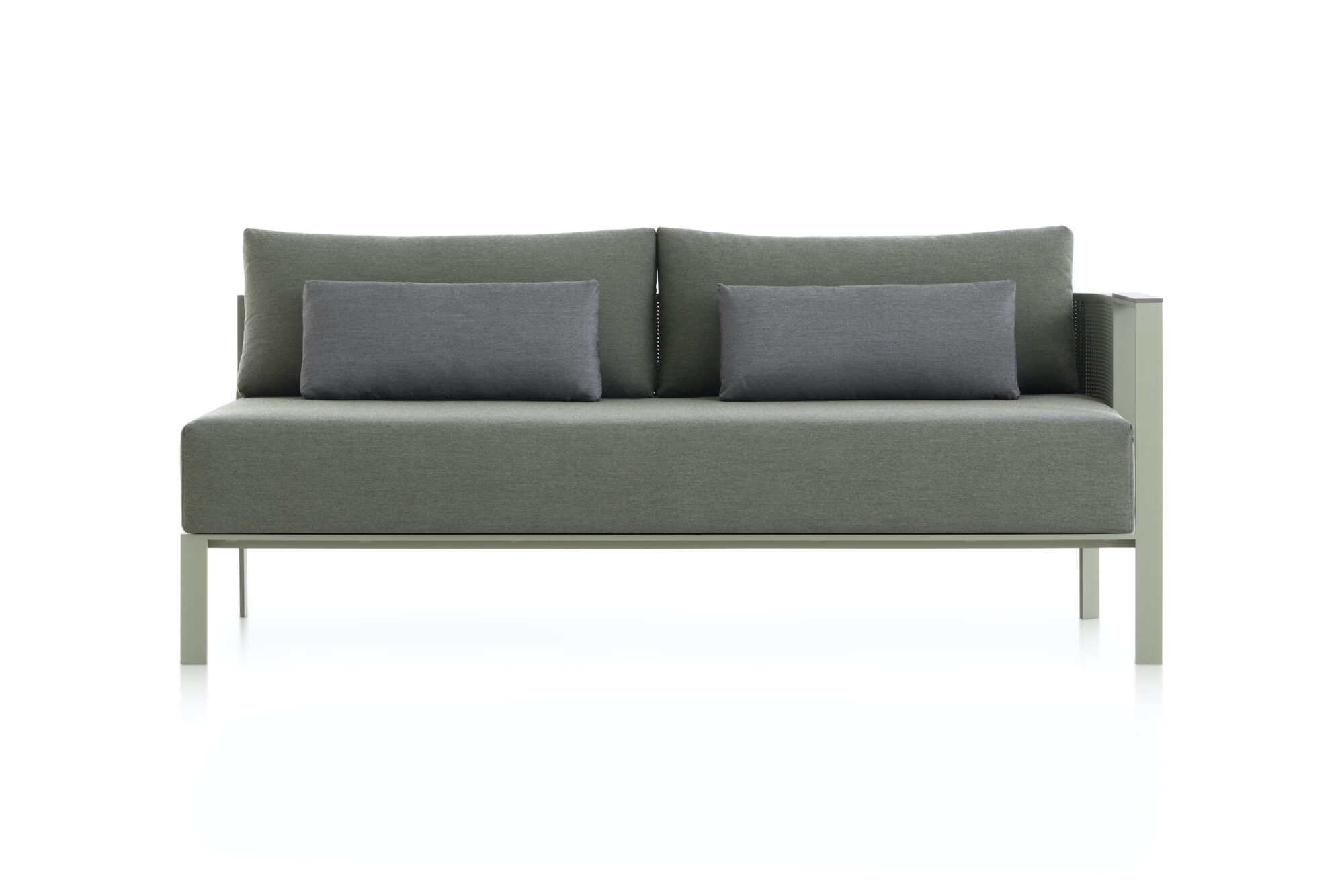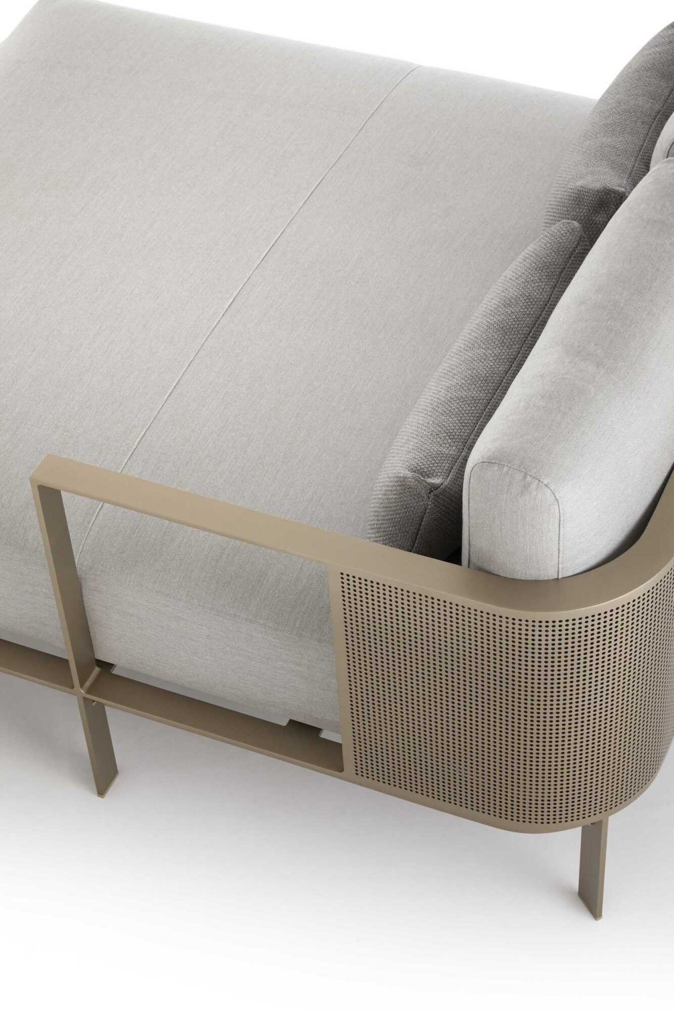 The sectional features powder-coated aluminium profiles welded to a micro-perforated mesh, along with Dekton® by Cosentino for durability and customisable finishes. Its cushions are made of polyurethane foam rubber covered with removable upholstery.