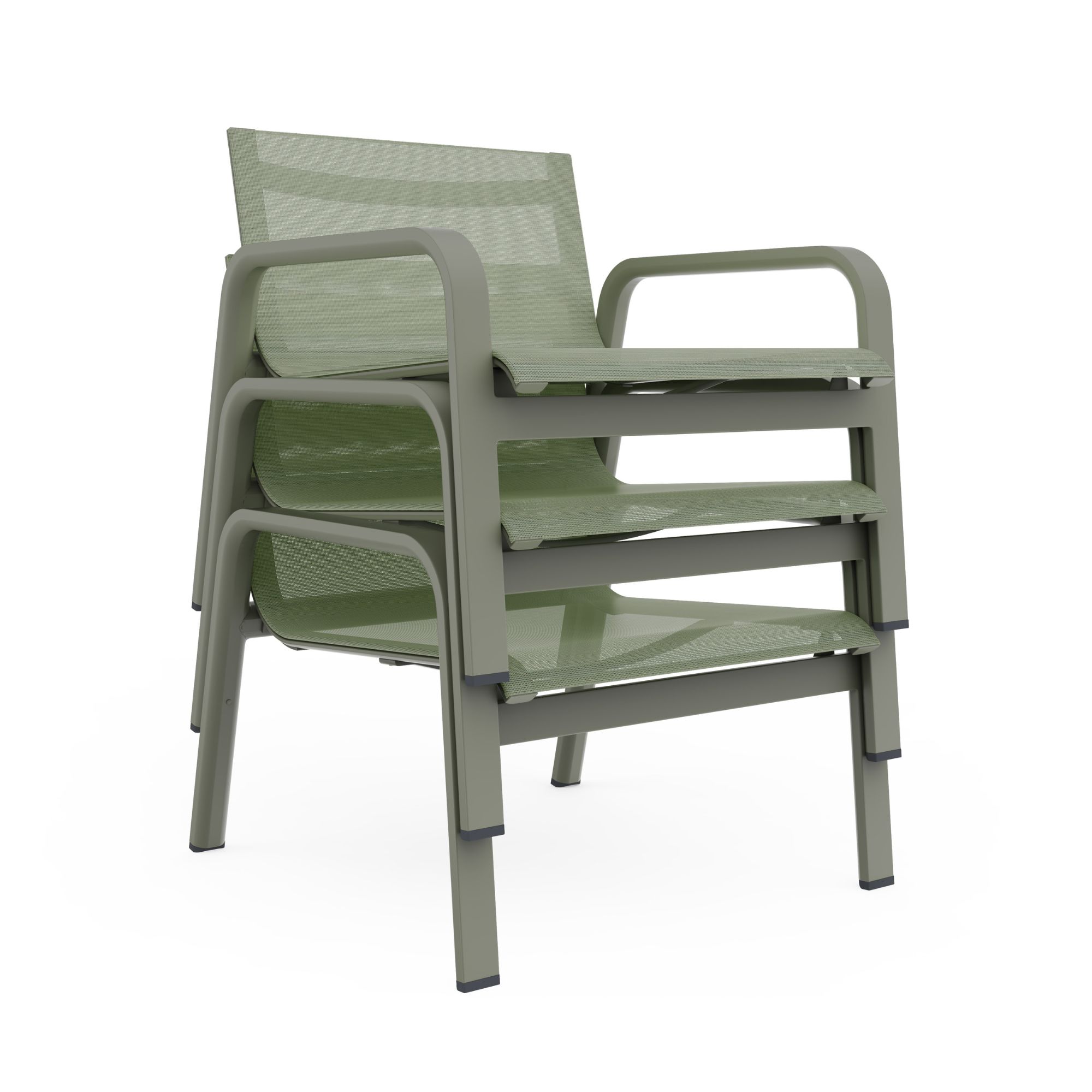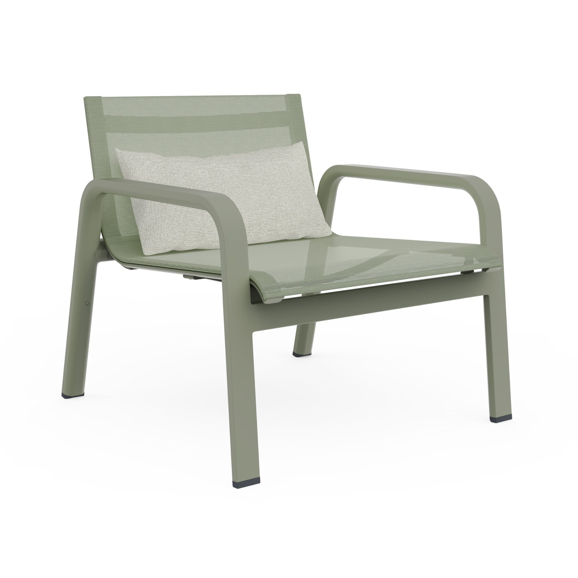 Stack lounge chair by Gandiablasco is made from thermo-lacquered extruding aluminium sections and is reduced to a minimum expression, with a self-supporting fabric element.