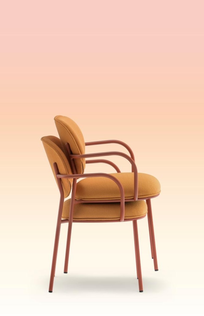 Stiel 2965 Armchair by Pedrali features a soft and rounded shapes in polyurethane foam on a curved round steel tube frame.Stackable with seat and backrest connected to the frame without visible fixing screws.Stiel collection focuses on the comfort and well-being to enjoy both in relax or relation spaces. The various fabric and metal finishes make Stiel suitable for residential or contract.