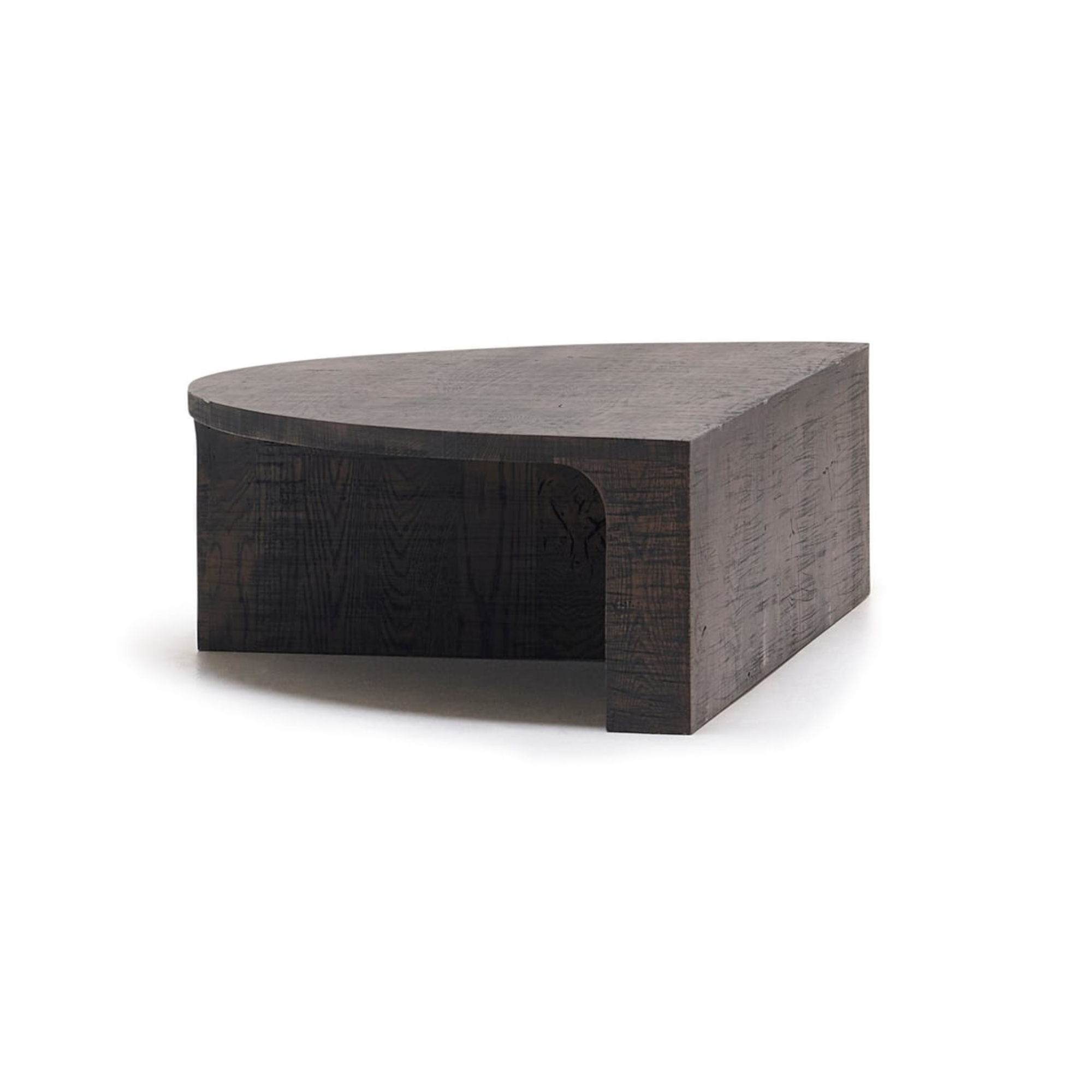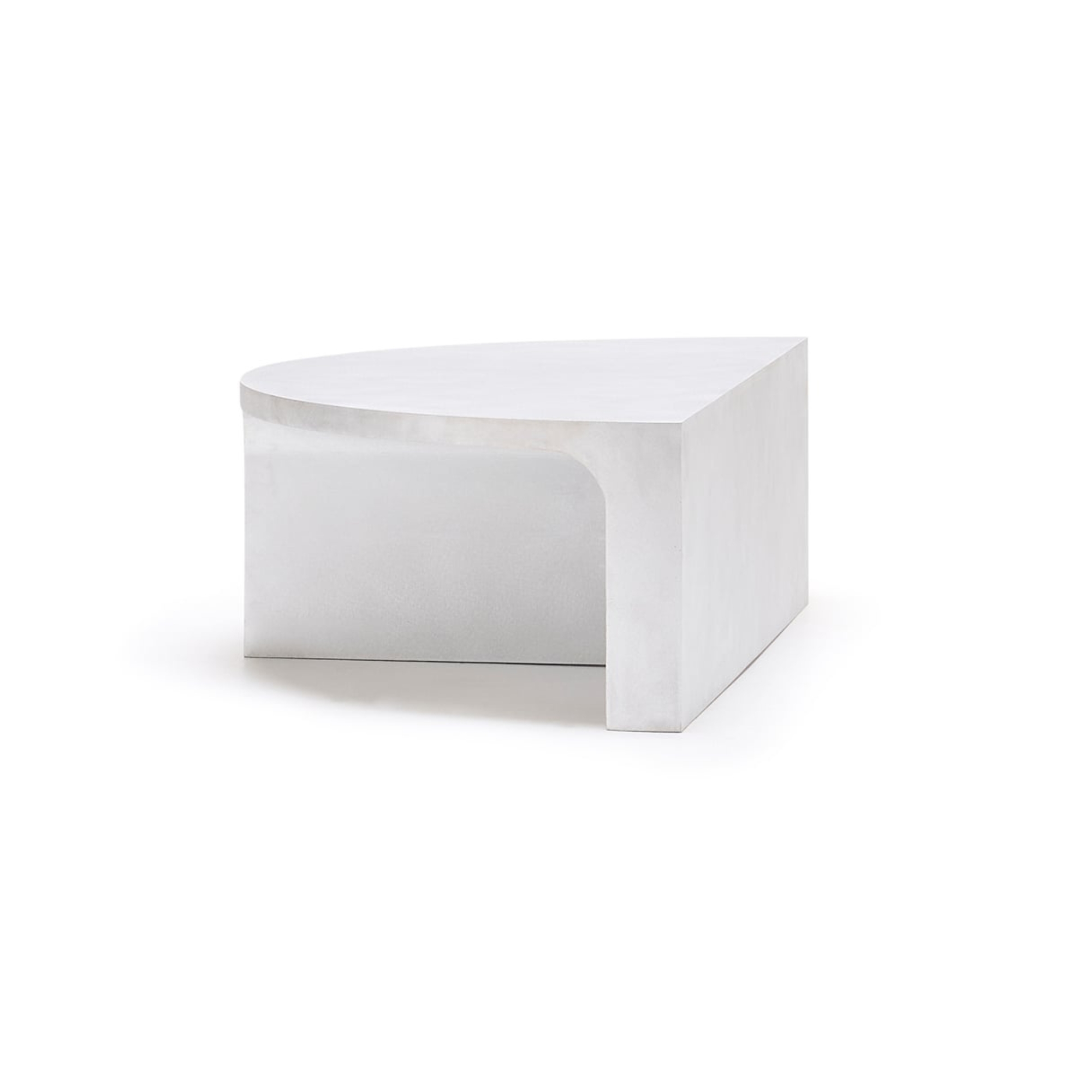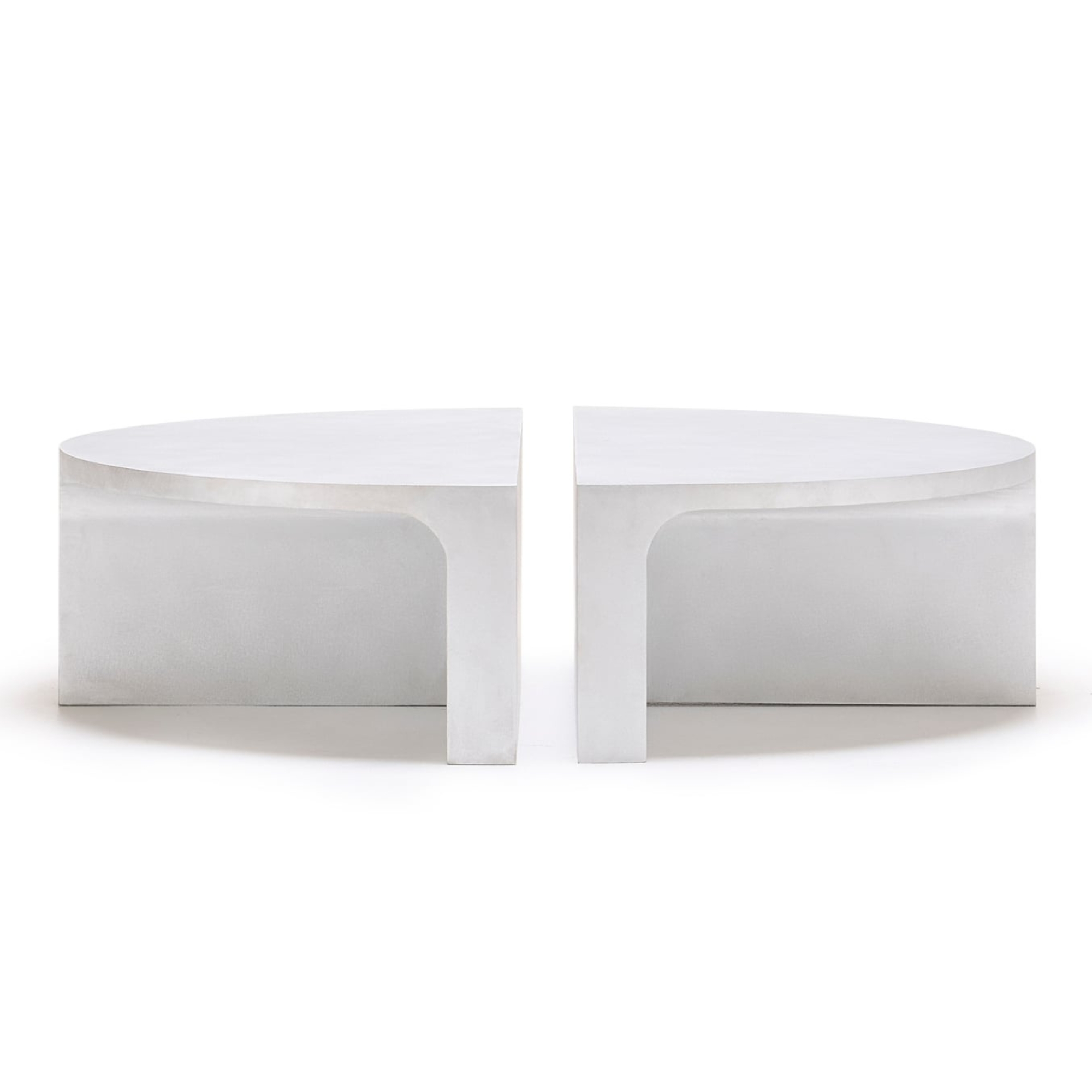 Its low, solid body brings a grounded, convenient quality to the room, while the seamless flow from the top’s circumference to the legs introduces a subtle elegance that contrasts with the table’s brutalist geometric forms. When joined, the two halves create a harmonious sense of balance and flow.