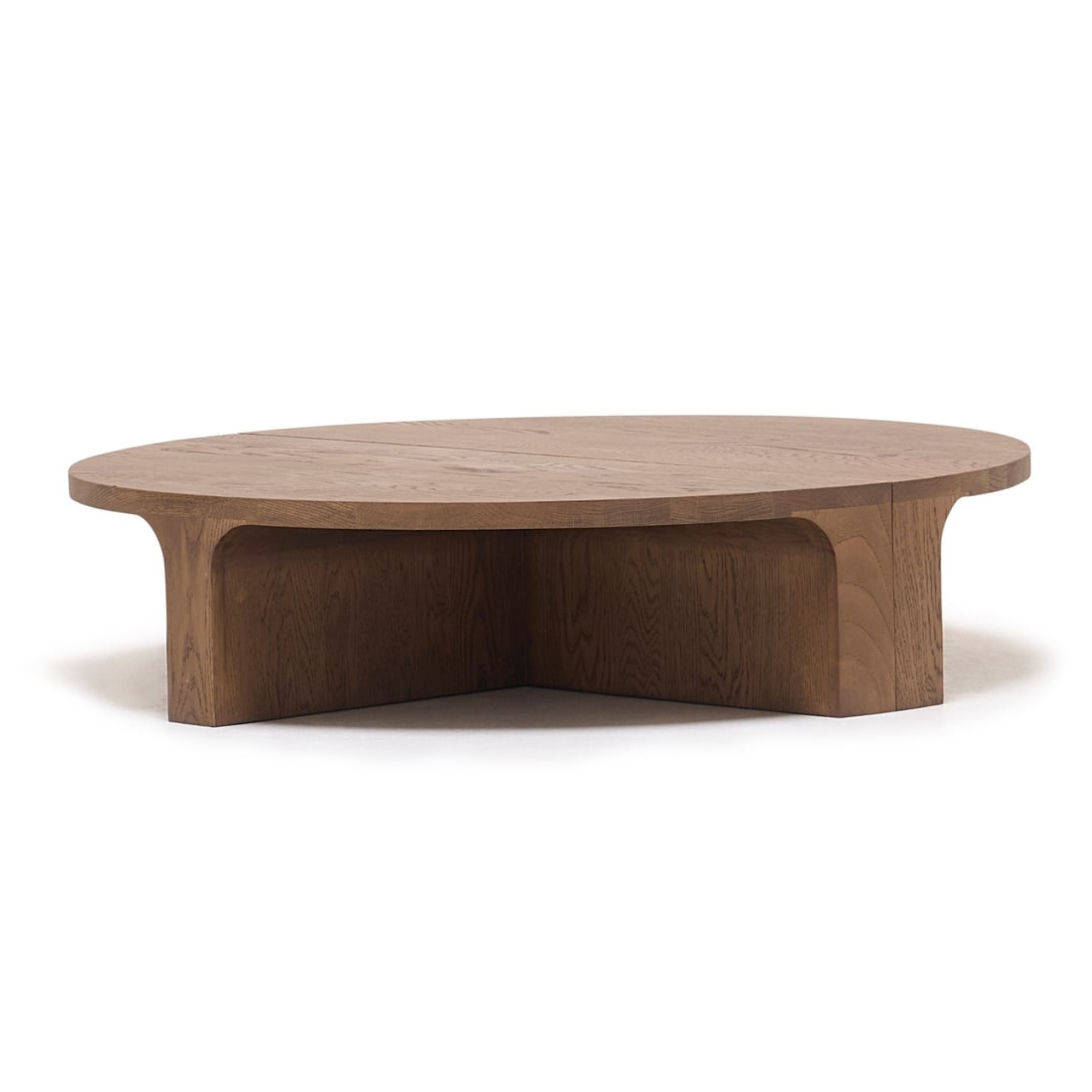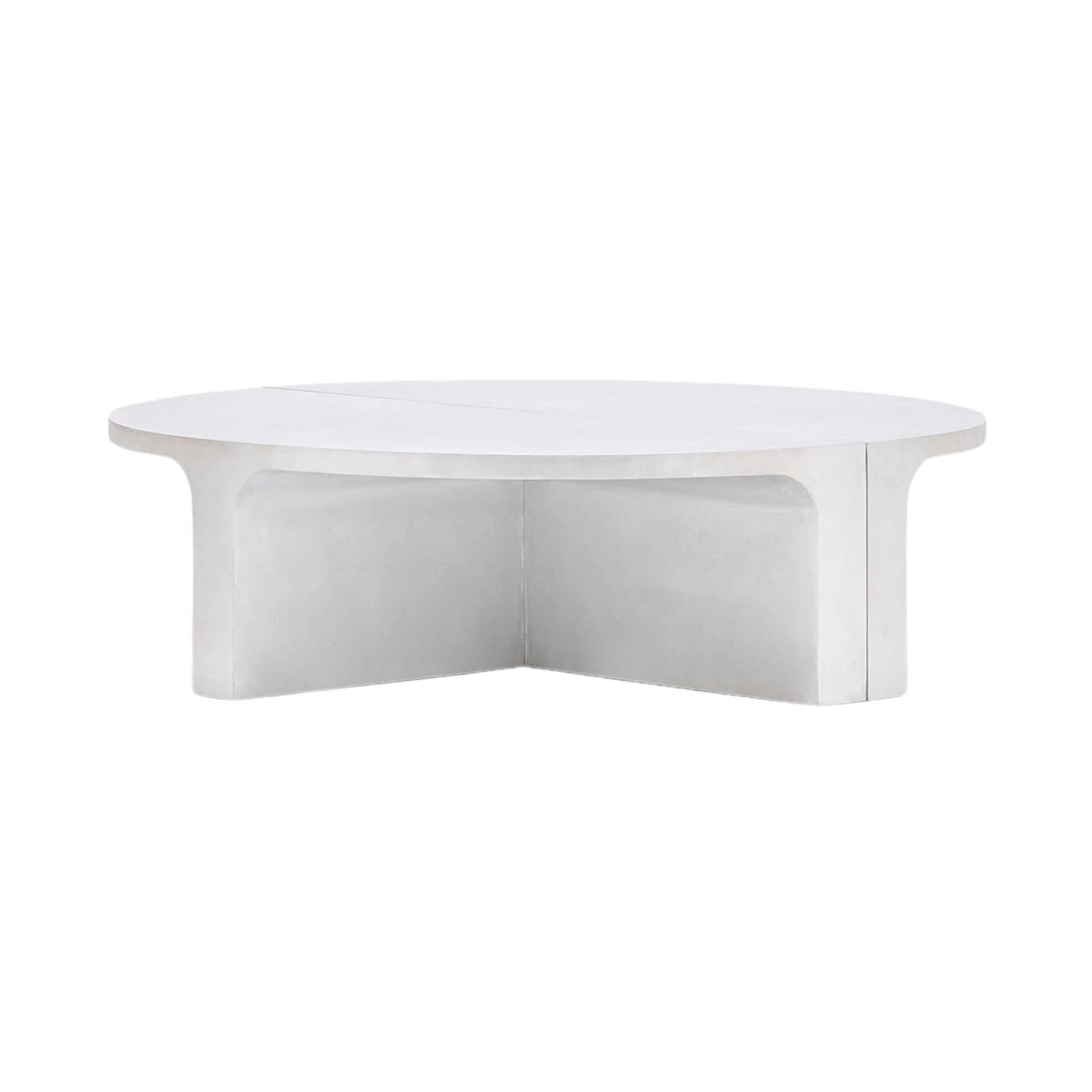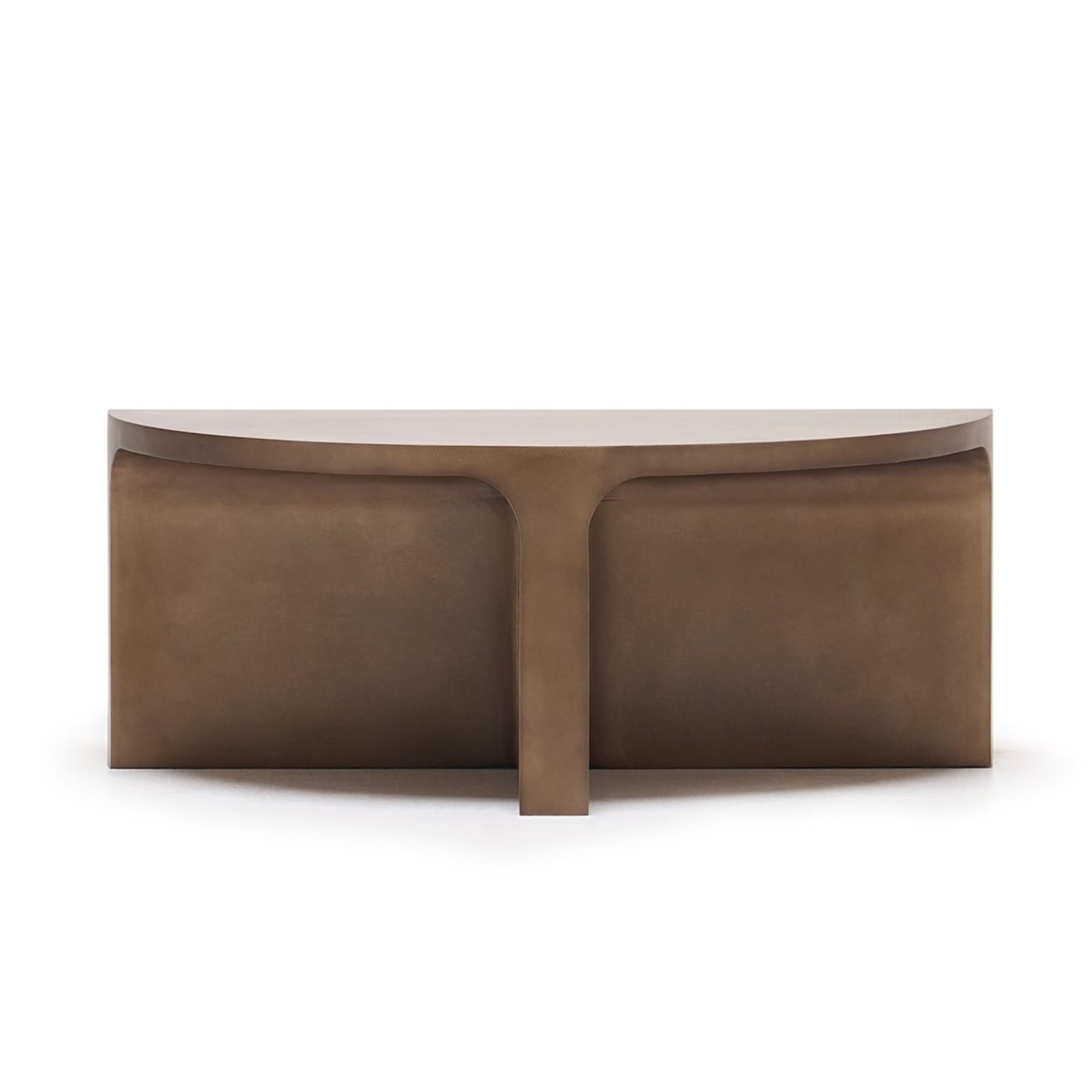 Its low, solid body brings a grounded, convenient quality to the room, while the seamless flow from the top’s circumference to the legs introduces a subtle elegance that contrasts with the table’s brutalist geometric forms. When joined, the two halves create a harmonious sense of balance and flow.