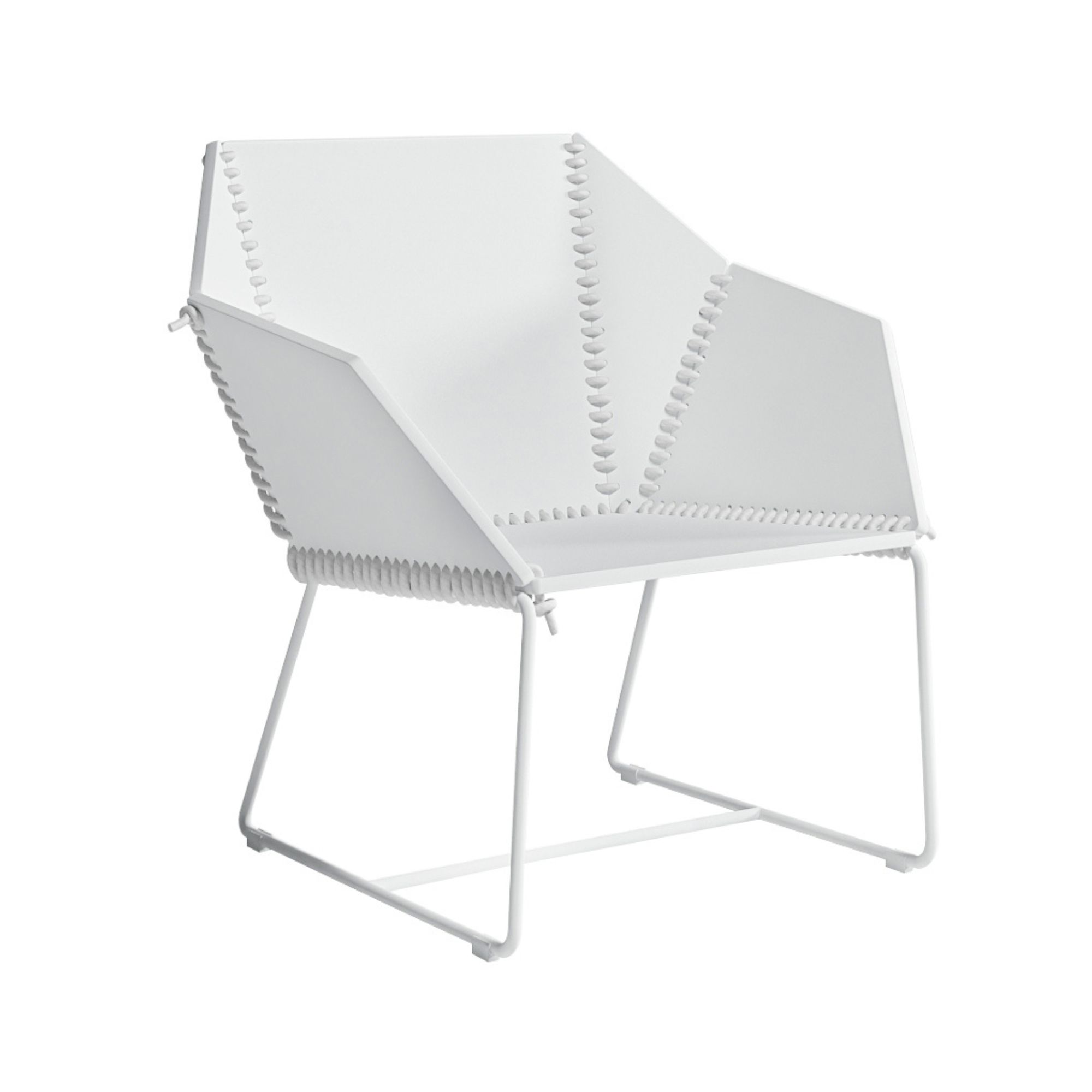 It is a designer armchair made with 100% recyclable polyethylene and thermo-lacquered zinc-plated steel. The rope that embroiders the frame is made of braided polyester available in different colours.