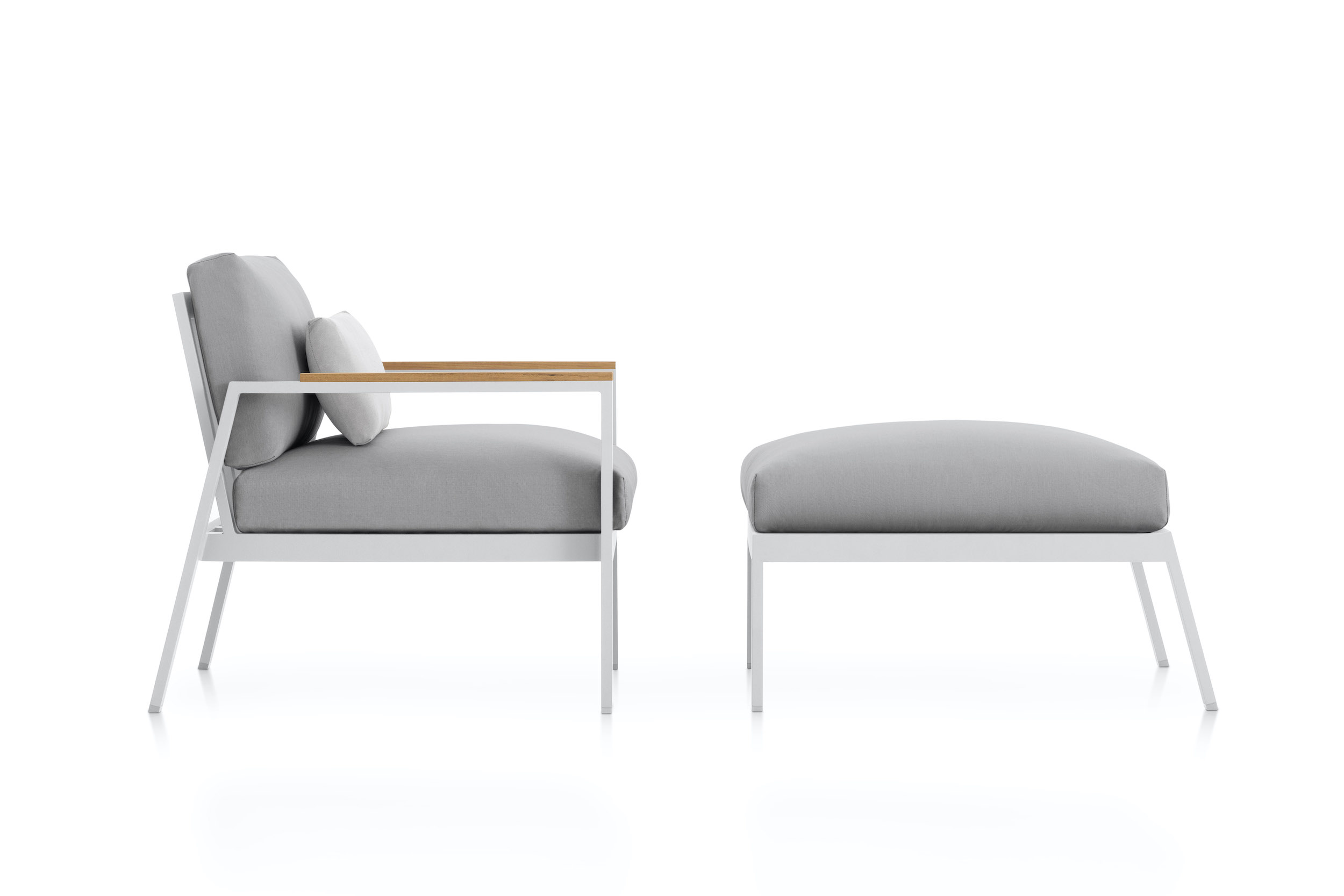 The Timeless Pouf for lounge chair completes the collection. It is a designer pouf made of welded aluminium profiles, on which the thick cushions rest. The cushions are made of polyurethane foam and covered with water repellent fabric.