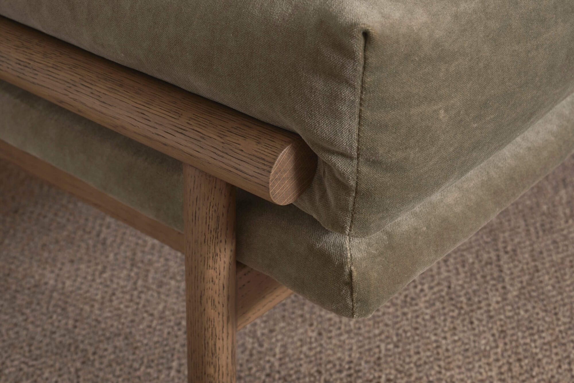 It features a solid oak frame with hand-sanded oval shapes and subtle tapered sections, lending a softness to its form. Visible tenon joins evoke the golden era of Danish woodworking, imbuing the chair with a timeless quality. The back cushion is supported by a sling made of robust Harness leather from Denmark’s renowned leather house Sørensen.