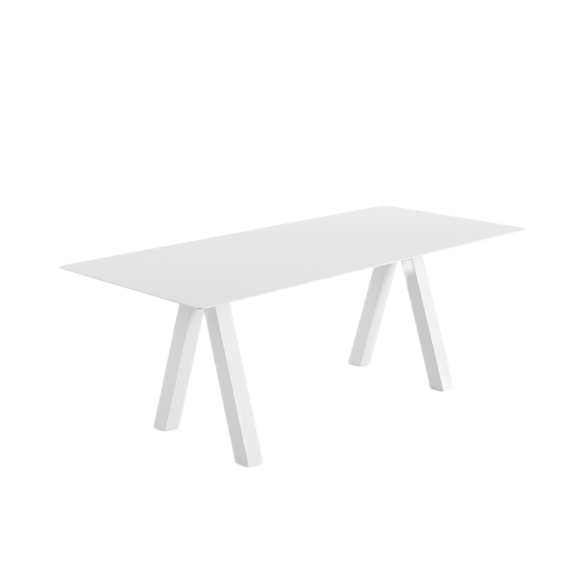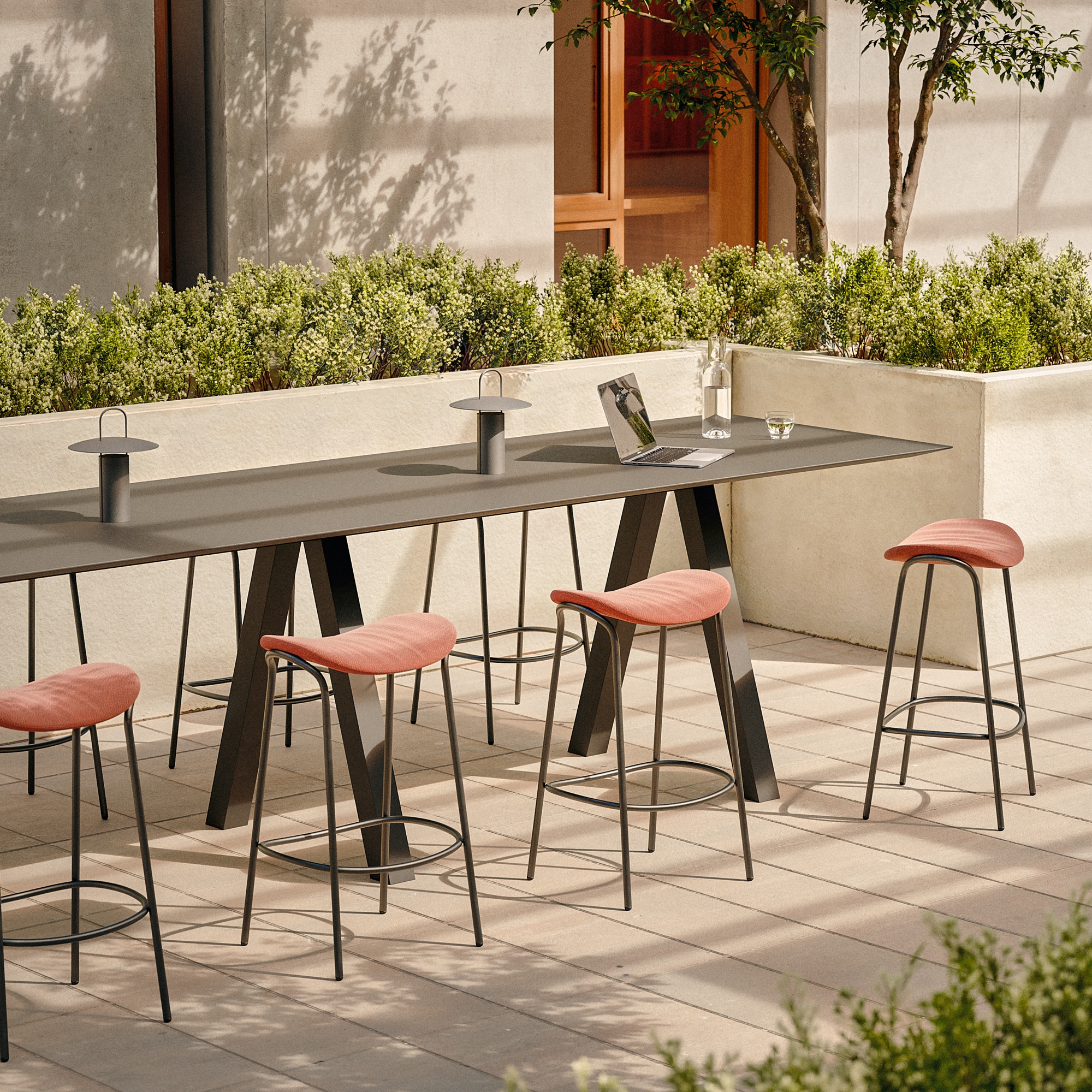 Trestle Outdoor High Table by Viccarbe is a robust and refined outdoor table, crafted to withstand the elements with its stainless steel structure and compact laminate top. Its clean lines and adjustable height options offer architectural versatility for a variety of exterior settings.