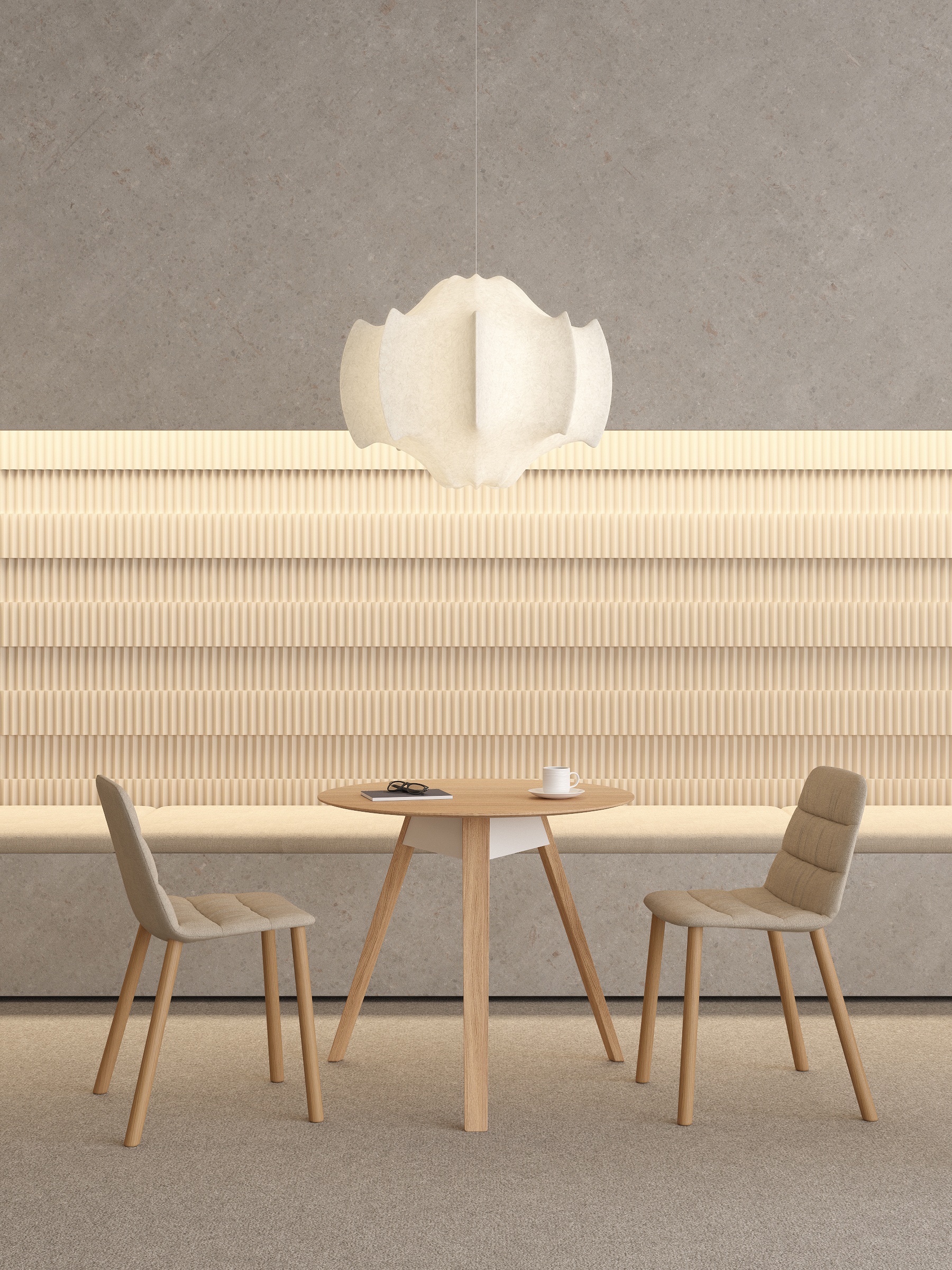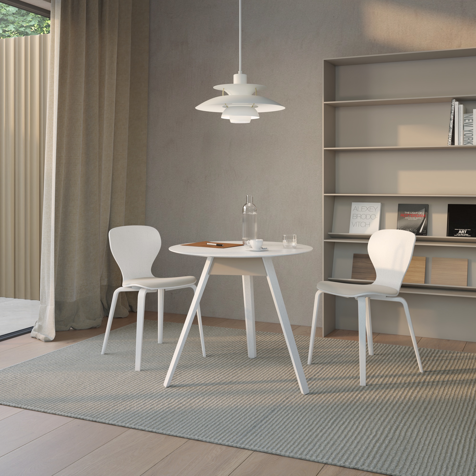 Trivio Table by Viccarbe is a refined composition that balances subtle texture with natural warmth. Its microtextured MDF surface is complemented by solid European oak legs, both finished with a restrained palette that enhances architectural clarity and tactile sophistication.