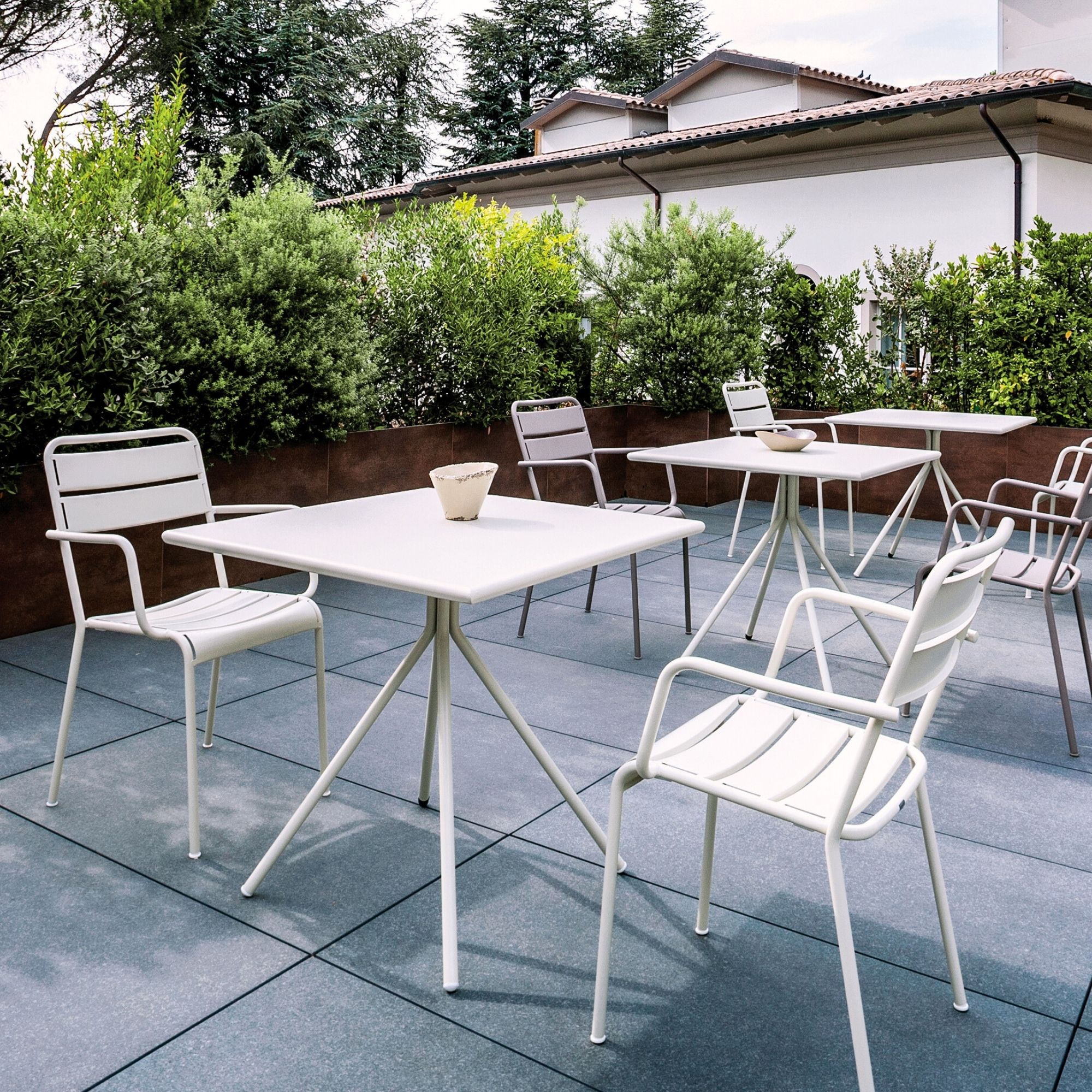Twist Table by Vermobil is a modern, minimalist dining solution designed for versatility and durability. Featuring a sleek metal top supported by a distinctive four-legged frame, it combines elegance with structural stability. Perfect for cafés, terraces, and residential settings, the Twist Table’s knockdown design allows for easy assembly and storage while maintaining a refined aesthetic.