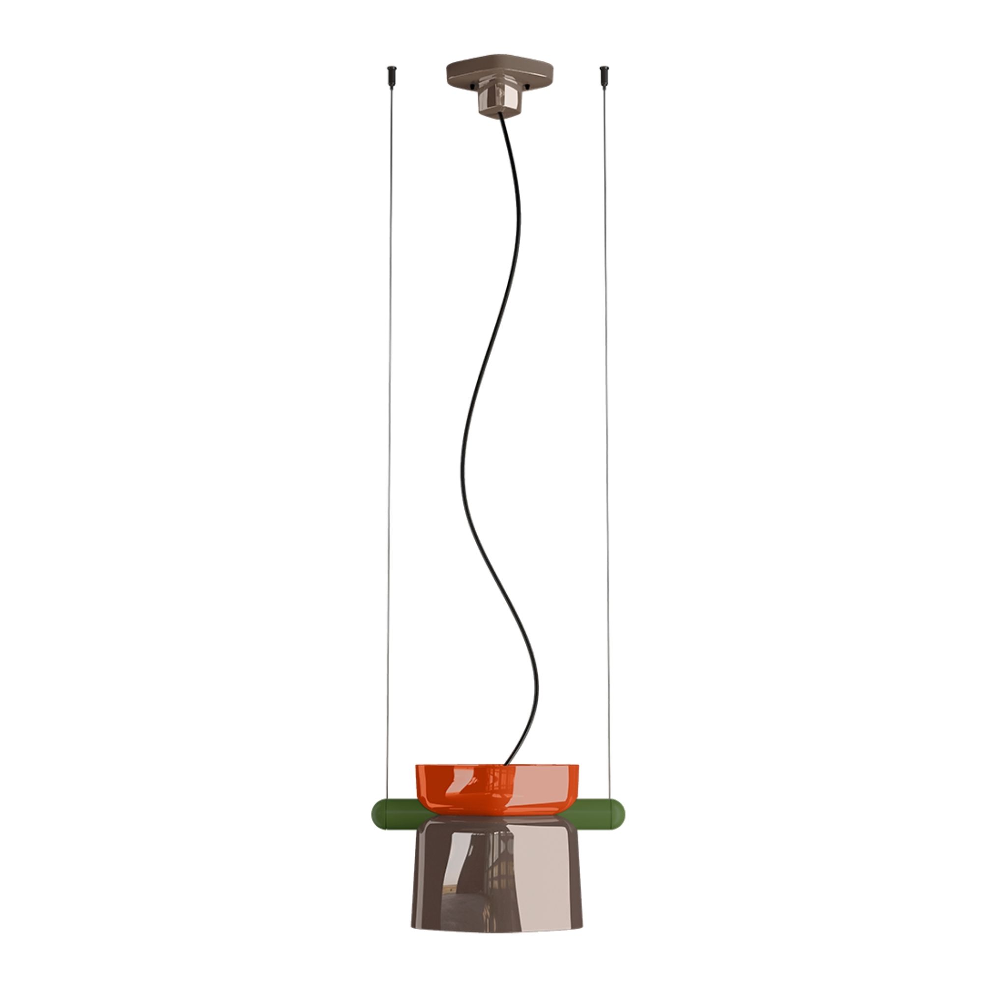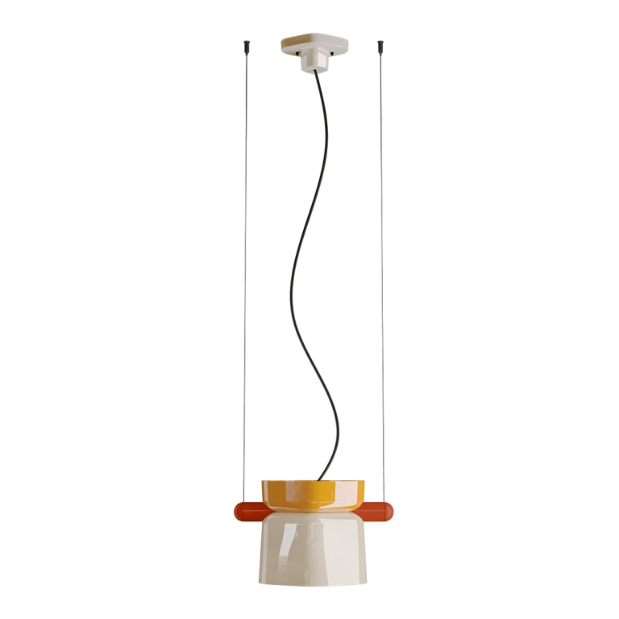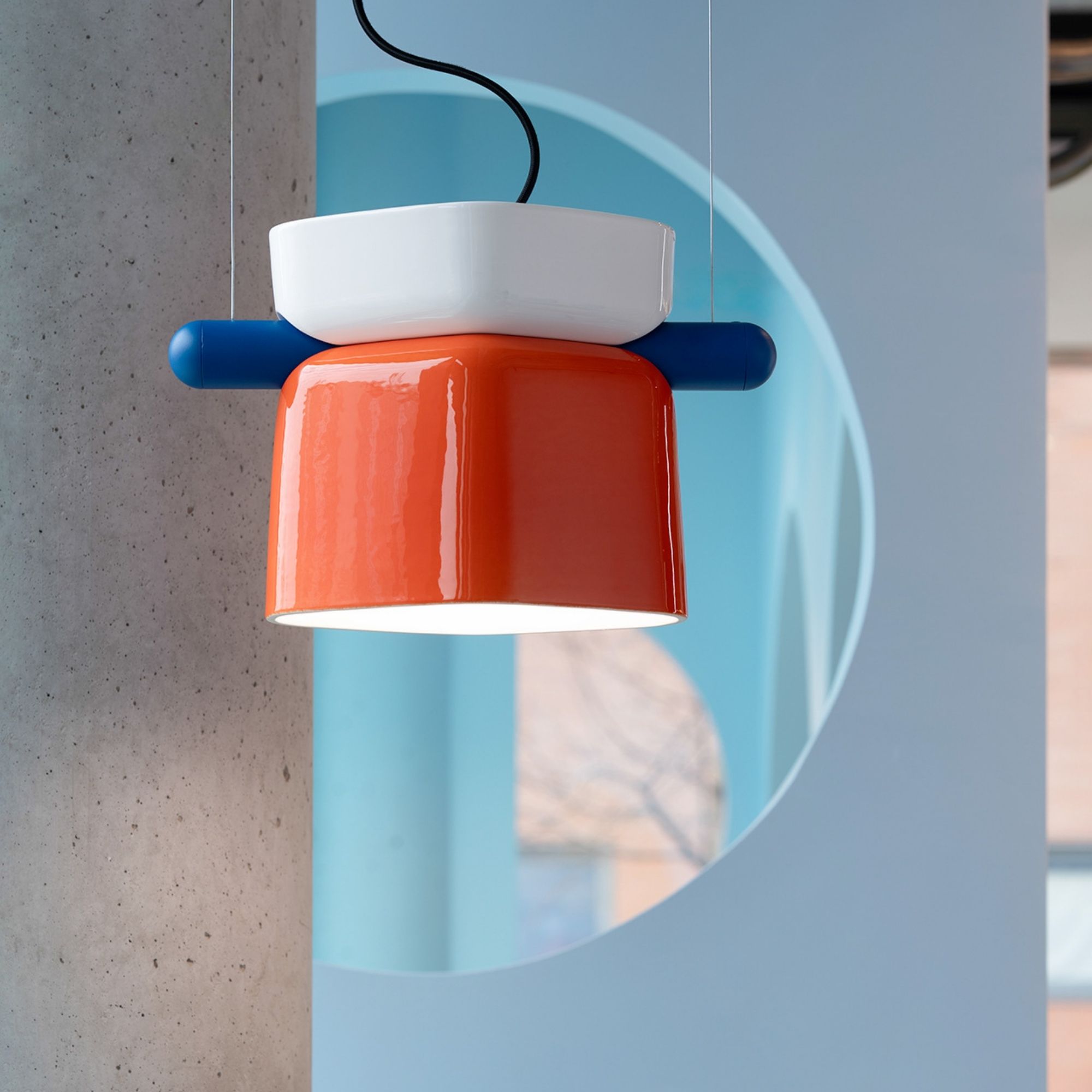 Yakitori Single Pendant by Ferroluce channels the convivial energy of Japanese street food culture. Its ceramic elements, suspended as though stacked on a skewer, recall the bustling atmosphere of markets, full of colour, rhythm and life. Each piece clips to a contrasting metal bar, creating a sculptural composition that feels both playful and refined.