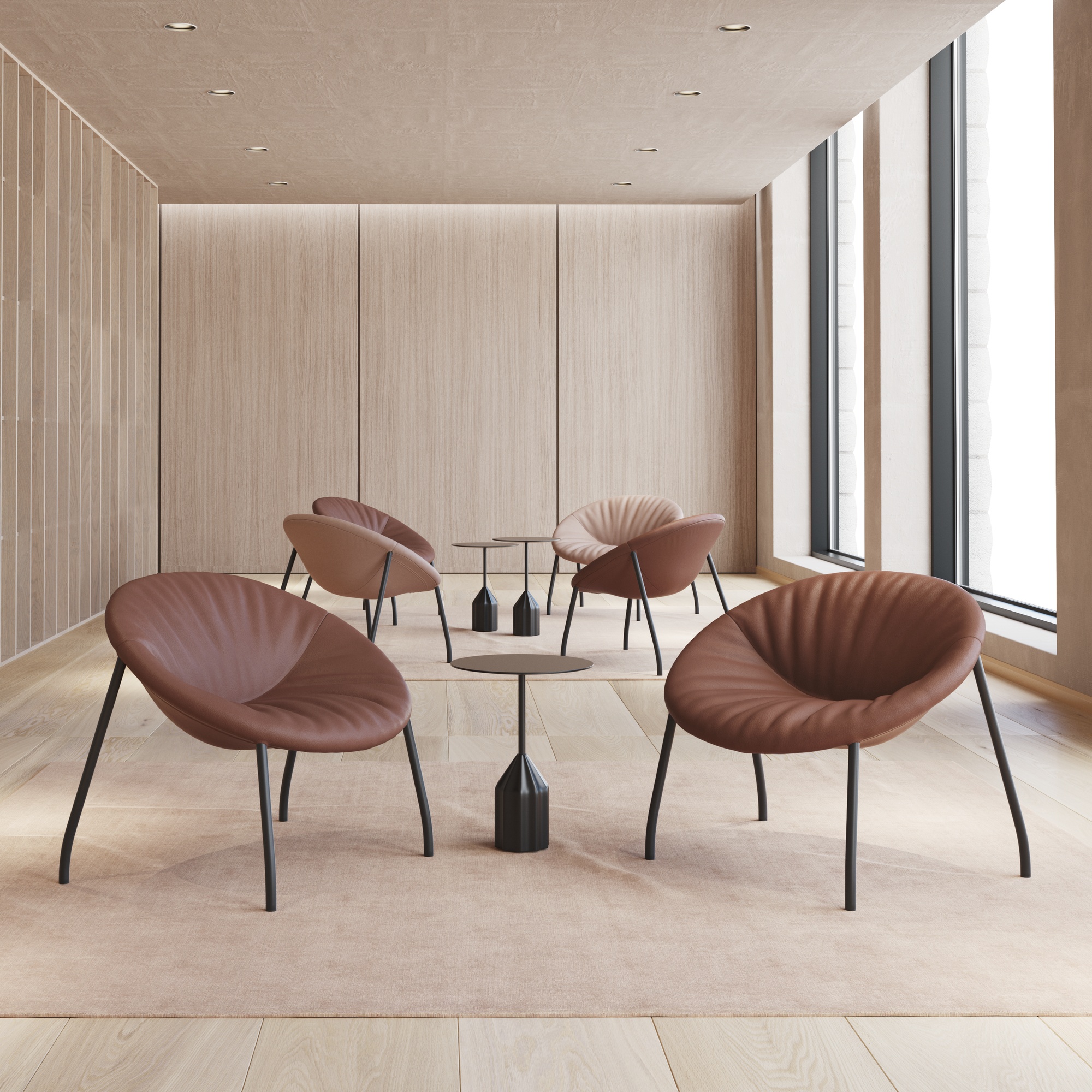 Zoco Lounge Chair by Viccarbe is crafted with a powder-coated steel structure and upholstered with in house fabrics and leathers, offering a refined balance of comfort and architectural presence. Its design embraces subtle irregularities in the upholstery, lending a relaxed yet sophisticated character ideal for indoor environments.