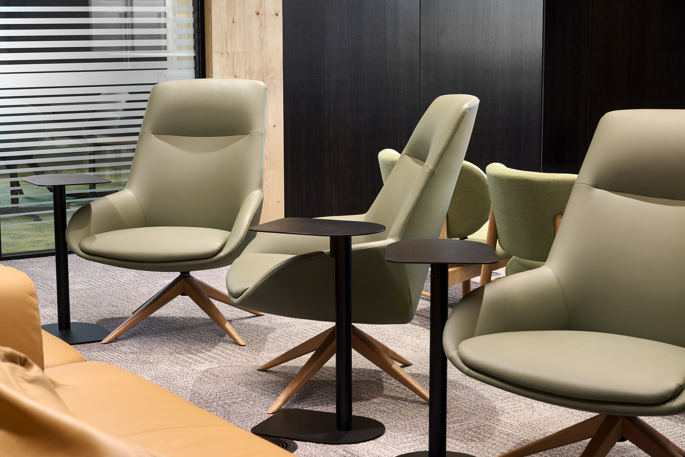 Workplace breakout spaces used Centro tables, Poise Chairs and AHA stools while Mexica Lounges and Mexica Armchairs, Noom Series 20 High Back Chair by Actiu were paired with Kile Coffee Tables and Brydie Lounges.