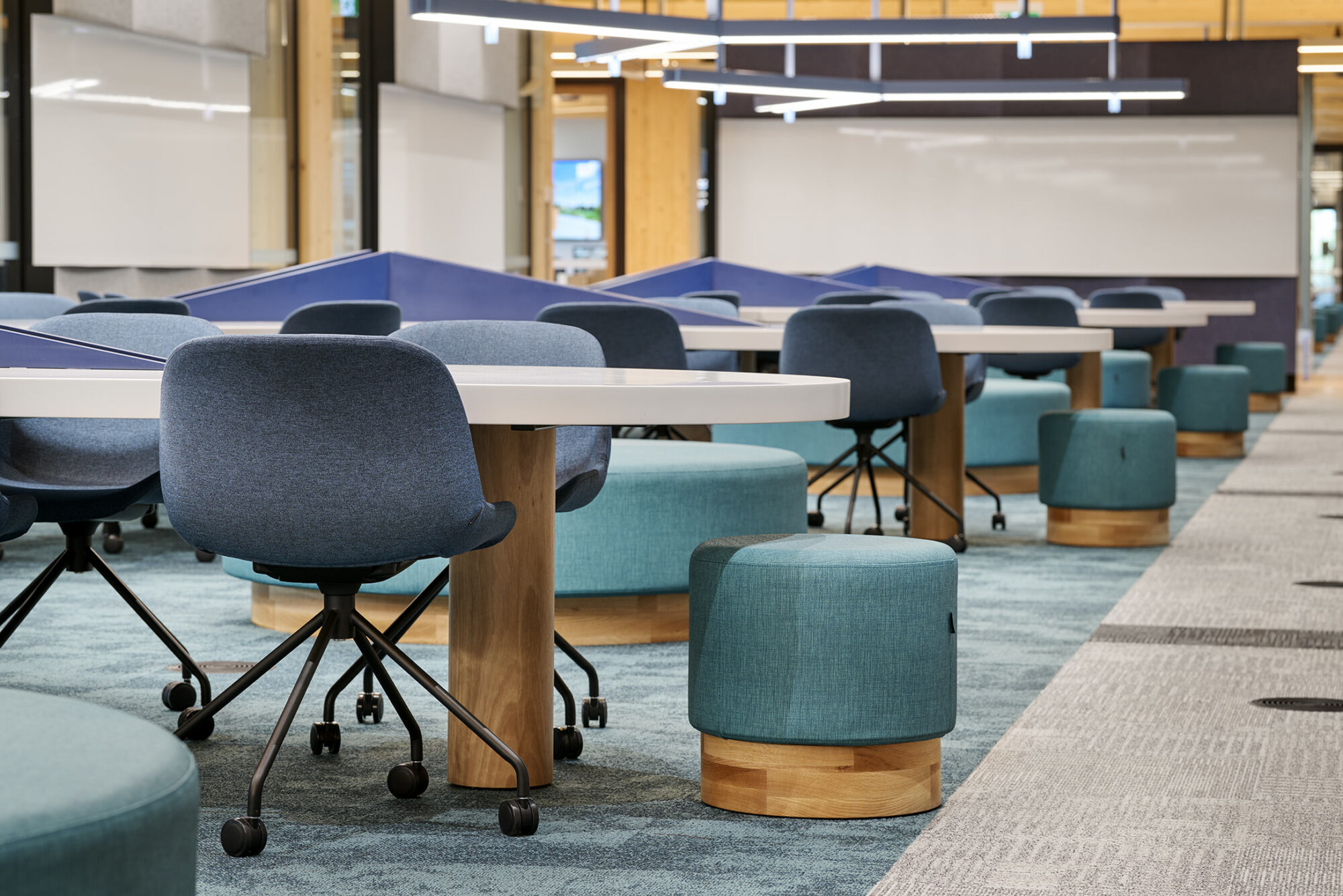 Tolv Inlay Chairs and Glide Stools by Sketch were partnered with the Fin Laptop tables for the Welcome Space in the Entrance of the new building.