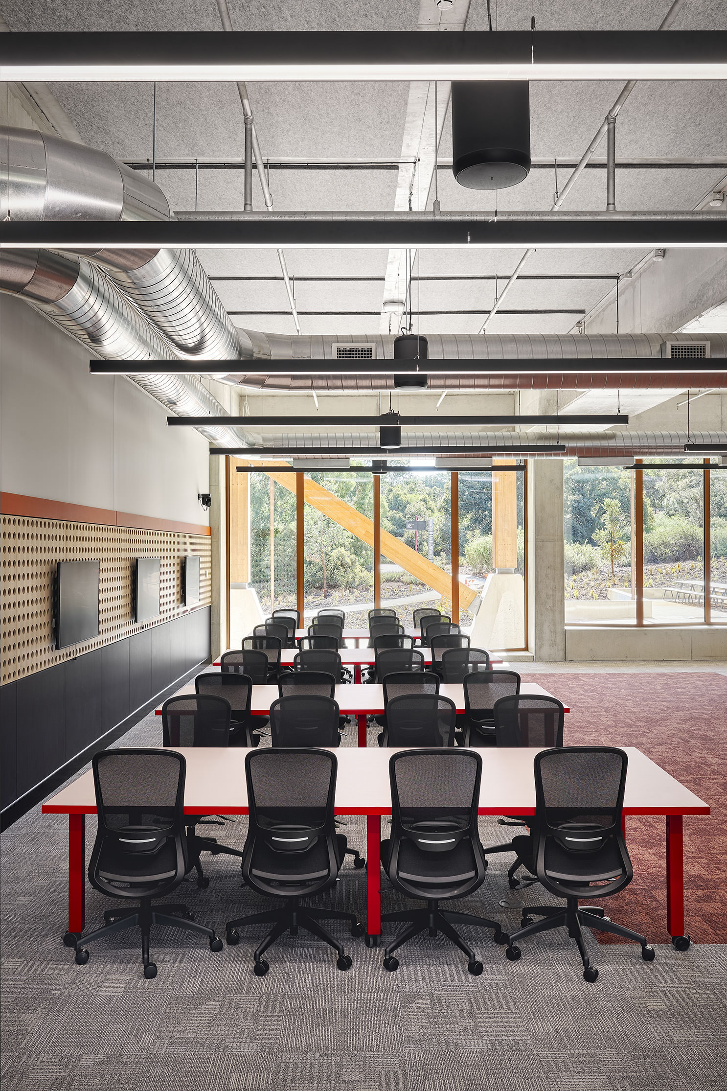 A distinct feature of Boola Katitjin is its use of a world-leading engineered timber frame. Marking the first mass timber building in Western Australia, this 16,000sqm building feels right at home in the bush campus of Murdoch University.