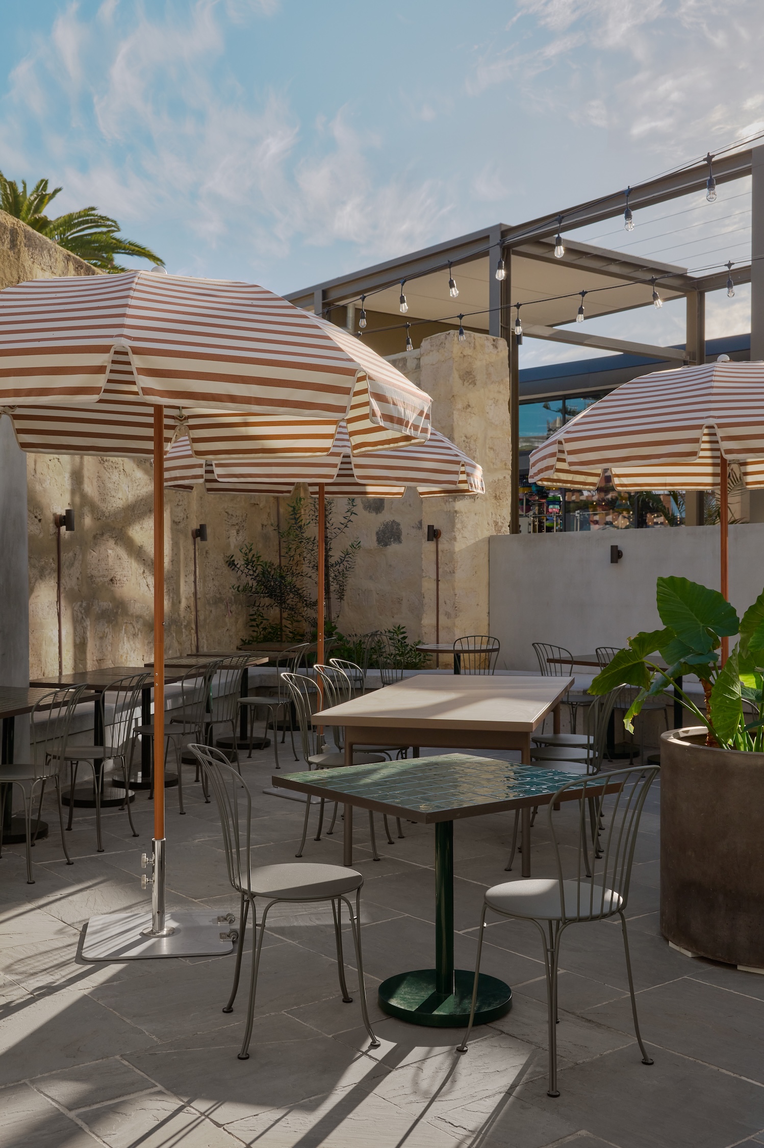 The Gandiablasco Onde outdoor dining table and Fermob Opera chairs were paired together in the open courtyard area to contrast against the Fremantle historic personality and natural limestone surroundings.