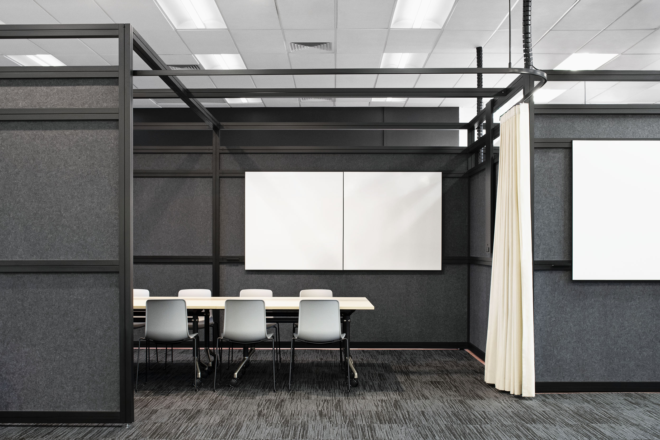 Further customization on the GELATO System enhanced the way teams could convene for meetings and brainstorming sessions with the additions of curtains and screen mounted whiteboards to the framework of the system.